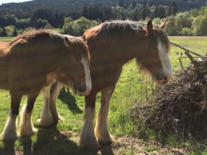 Shasta (left) is a genuine Budweiser Clydesdale, foaled at Anheuser-Busch’s Warm Springs Farm in Missouri. She was sold out of their breeding herd because she was too small, but at 16.2 hands and 1,750 pounds, she’s perfect for us. Shasta is opinionated, but steady. She is trained to ride and drive.