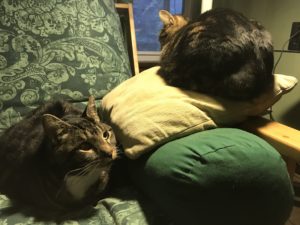 Fumi (right) came to us via a friend of Draven’s during our first winter here. We were getting overrun by mice, as BC was still at the old barn in Independence with the horses, so Fumi went right to work when she got here. She is a vicious hunter who always leaves the evidence of her kills in a particular cardboard box that we now refer to as ”the murder box“. Fumi is highly opinionated, and not overly fond of unfamiliar faces (or cameras, as you can see from the photo). Fumi is a popular Japanese feminine name, as well as a word translating roughly as “flavor”; both seem appropriate, in this case.
